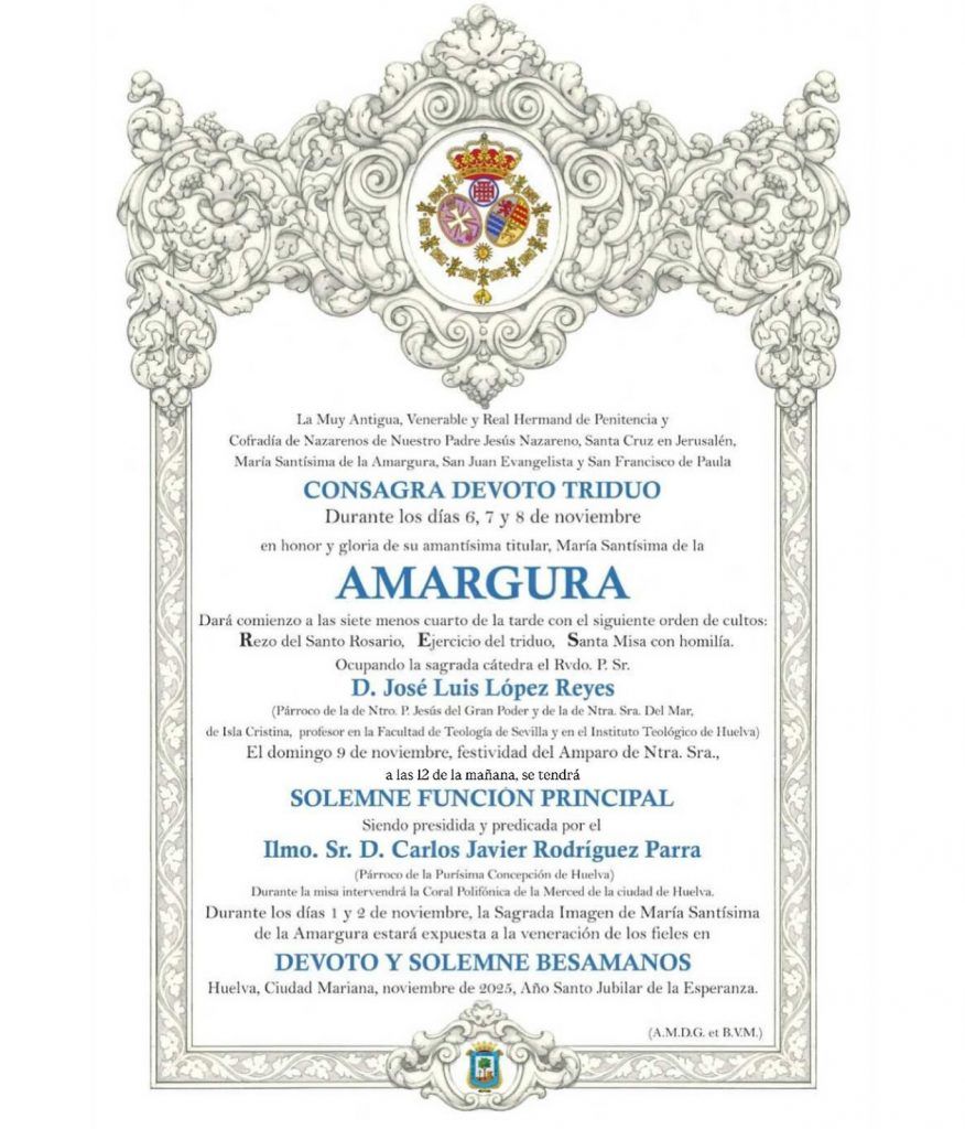El anual triduo de reglas, tendrá lugar los días 6, 7 y 8 de noviembre, ocupando la sagrada cátedra el Rvdo. P. Sr. D. José Luis López Reyes, siendo el domingo 9, festividad del Amparo de Nuestra Señora, la solemne función a las 12 de la mañana, presidida y predicada por nuestro párroco y director espiritual el Ilmo. Sr. D. Carlos Javier Rodríguez Parra.